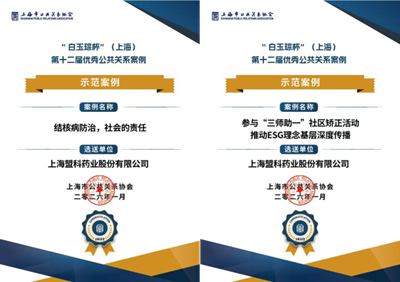 近日,上海市公共关系协会主办的“白玉琮杯”(上海)第十二届优秀公共关系案例评选活动落下帷幕。由上海盟科药业股份有限公司(以下简称“盟科药业”,688373.SH)选送的《结核病防治,社会的责任》与《参与“三师助一”社区矫正活动,推动ESG理念基层深度传播》两个案例,双双斩获“白玉琮示范案例”奖。